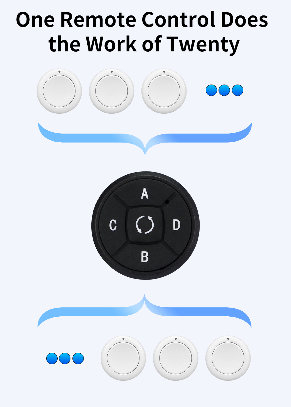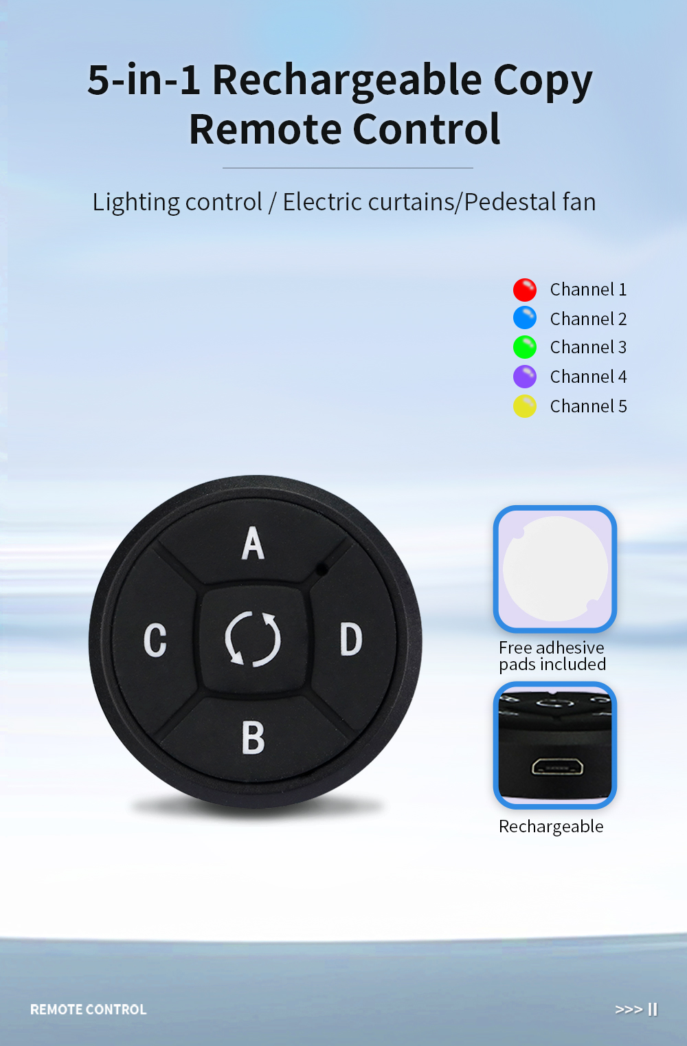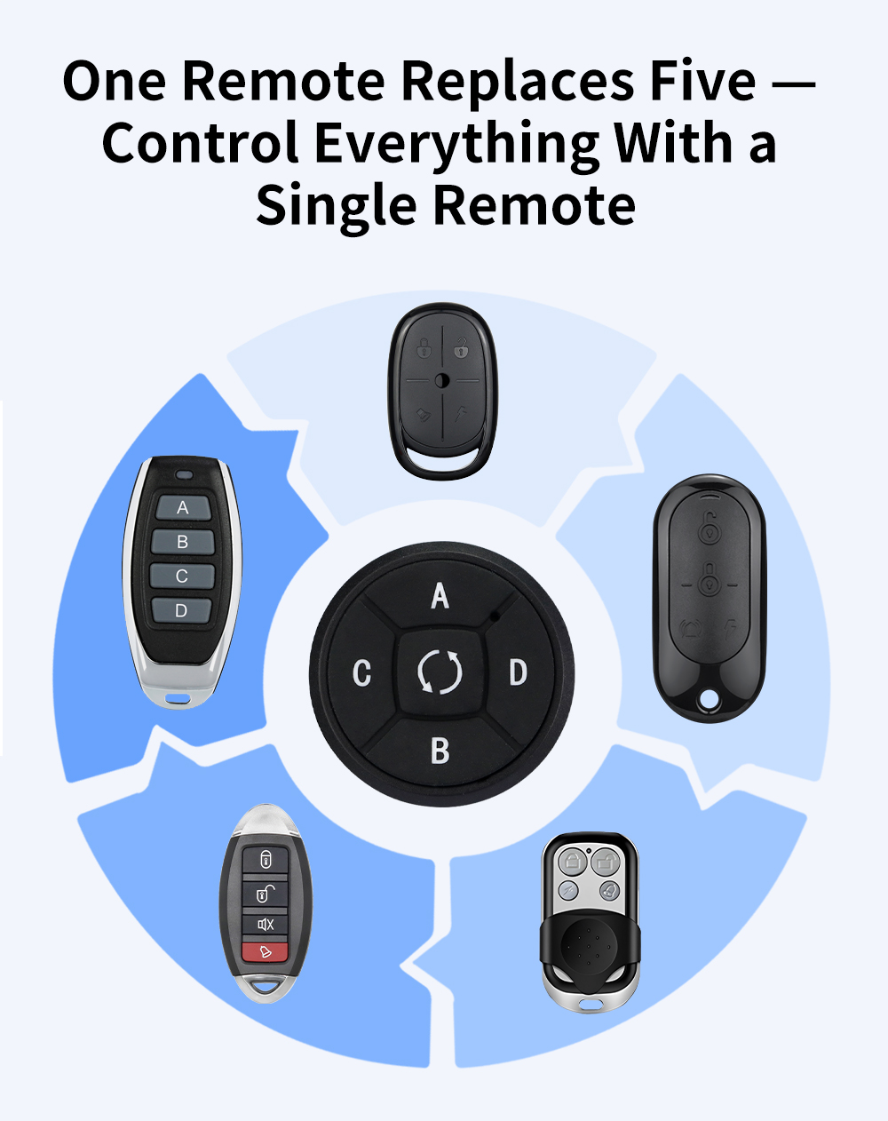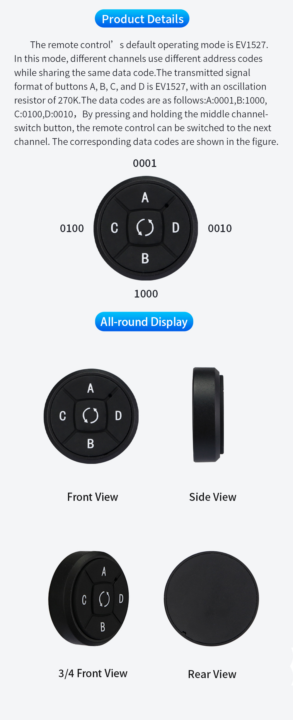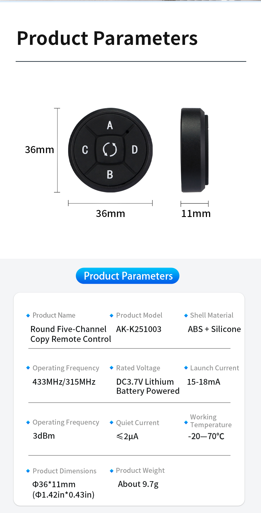 *Round 5 Channel Copy Remote Control Key Selling Points Round shape mini size compact and lightweight easy to carry in pocket bag or on keychain
